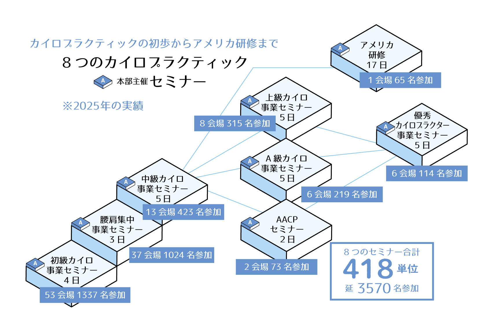 JCA本部主催のカイロプラクティックセミナーは下記のとおり、初級カイロ事業セミナーからアメリカ研修まで8つのセミナー〈座学〉を基本としています。このセミナーの合計単位数は418単位となります。